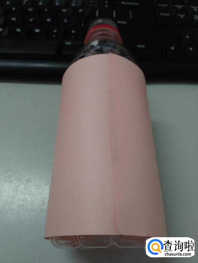 先从彩纸上剪一个长方形,长方形的长边要比塑料瓶下面圆柱的周长多一厘米,用来粘合在一起。