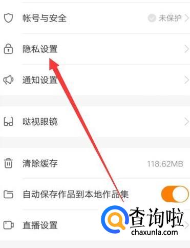 在“设置”界面,找到“隐私设置”,点击并进入,如图所示。