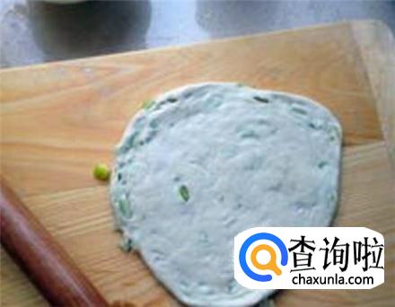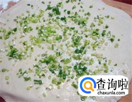 用擀面杖将面团擀成一张薄面皮,在上面倒入一些食用油,玉米胚芽油以及花生油是最好的,在面皮上撒入切细的葱花,和一些食盐。