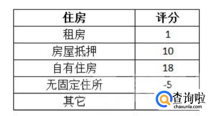 然后就是住房情况,是否总有房产,以及是否有工作和入职时长,具体评分标准见下图。