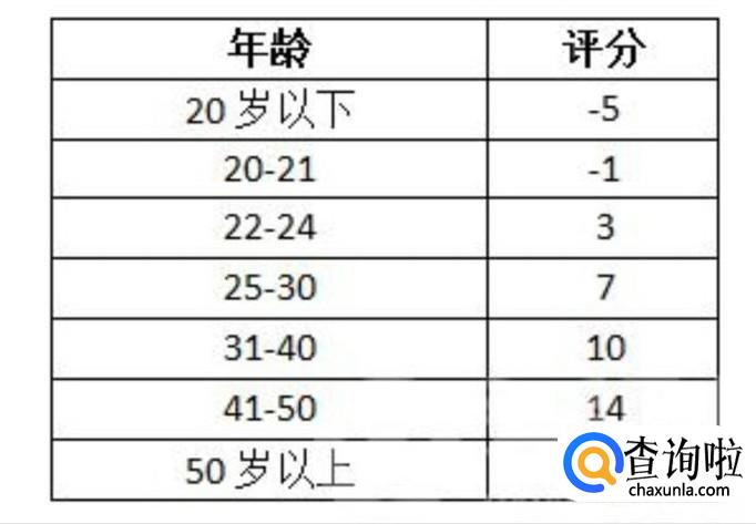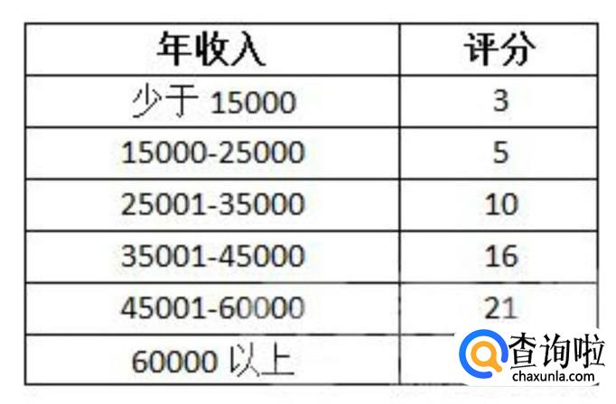 首先是根据年收入的多少来评分,共分为六个等级,具体评分标准见下图。然后就是年龄,分为七个等级,具体评分标准见下图。