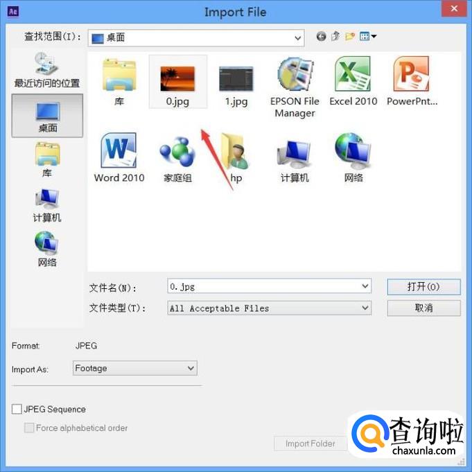 打开AE之后,我们按下Ctrl+I键在弹出的对话框内找到我们需要的图片素材,如图所示:
