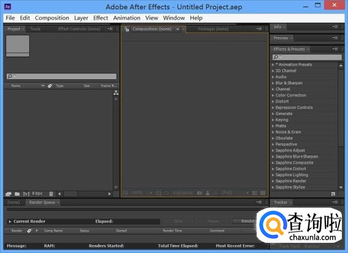我们在桌面上双击AE的快捷图标,将AE这款软件打开,进入该软件的操作界面如图所示: