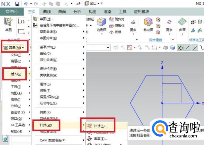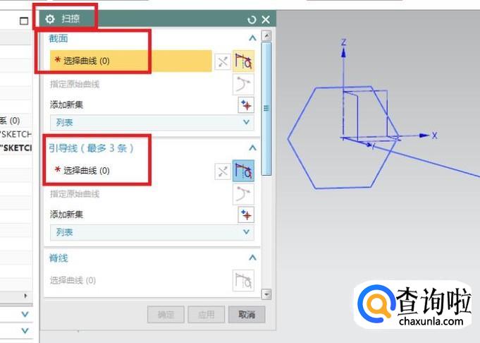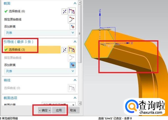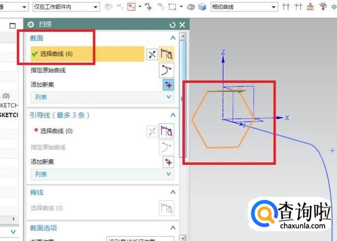 截面一栏选择曲线:草图中的正六边形一条边一条边的按顺序去选择,六条边全部选中。