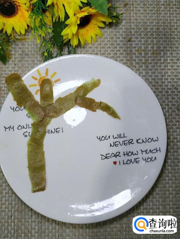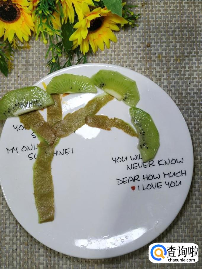 用削皮刀削去猕猴桃的外皮,将猕猴桃的外皮,摆在盘中,摆成一棵树的树干的样子,猕猴桃的外皮呈棕色,特别适合做树干。