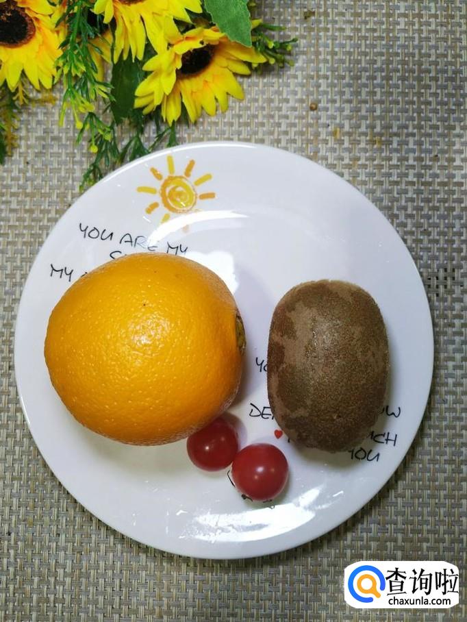 准备一个橙子,一个猕猴桃,适量圣女果,用清水洗净后,放入盘中备用。