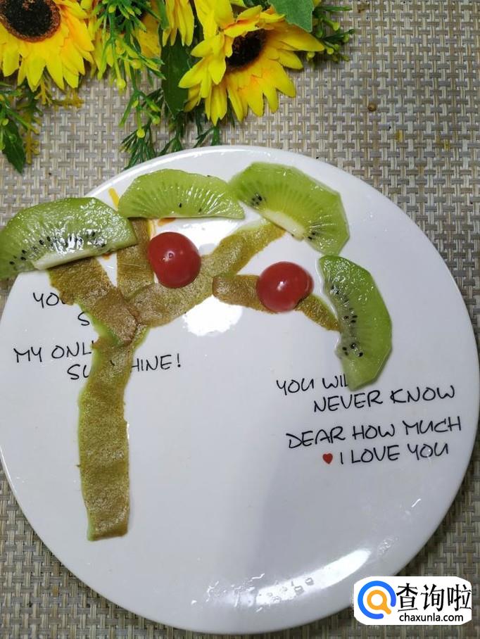 然后用刀将猕猴桃切成薄片,用刀对半切开,放在树干上面,做成树的叶子,将圣女果,对半切开后,放在树上,做成大树的果实。