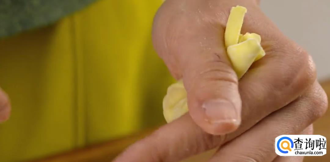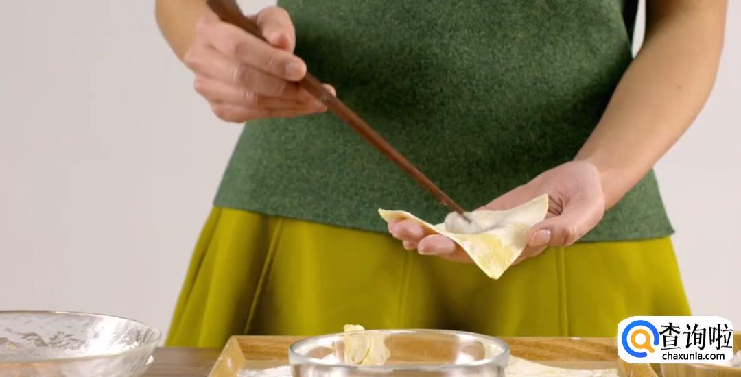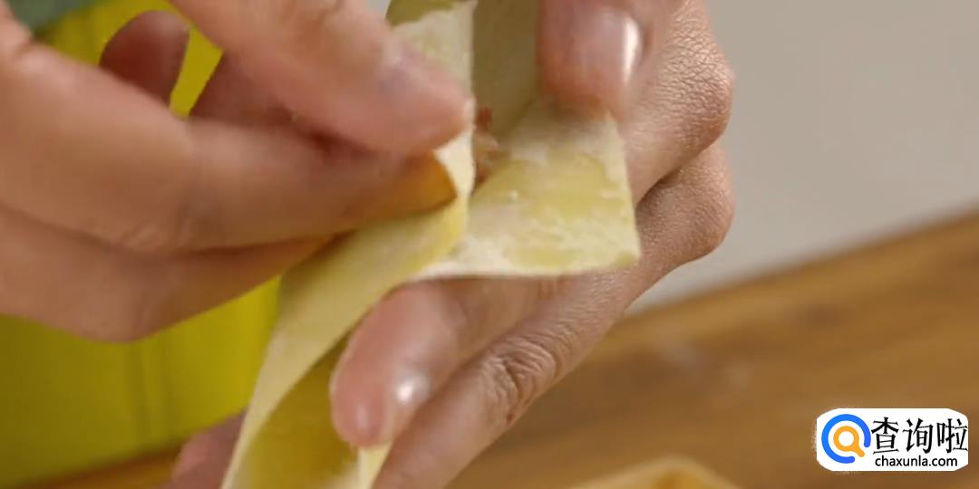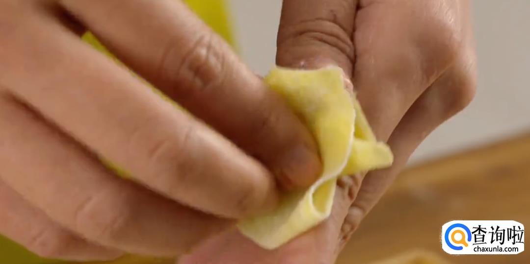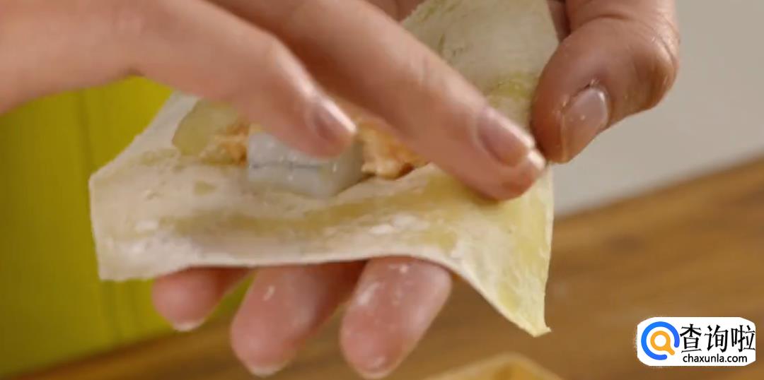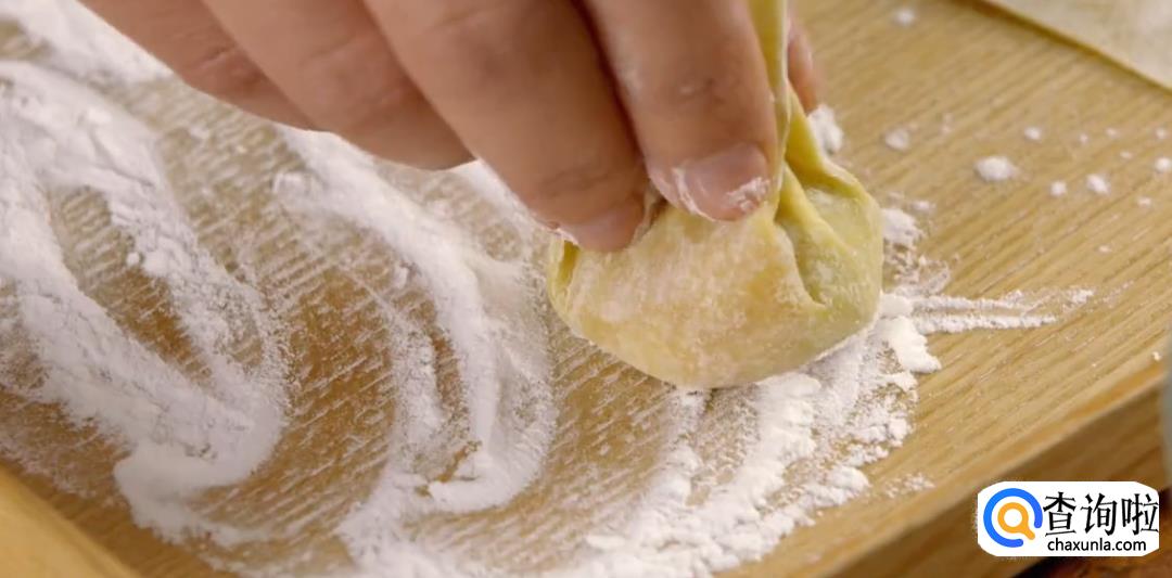 用手指沾水在云吞皮两边点一下,然后对折起来,再用另一只手的虎口加紧收口,合拢成凤尾状,一个云吞就包好了。