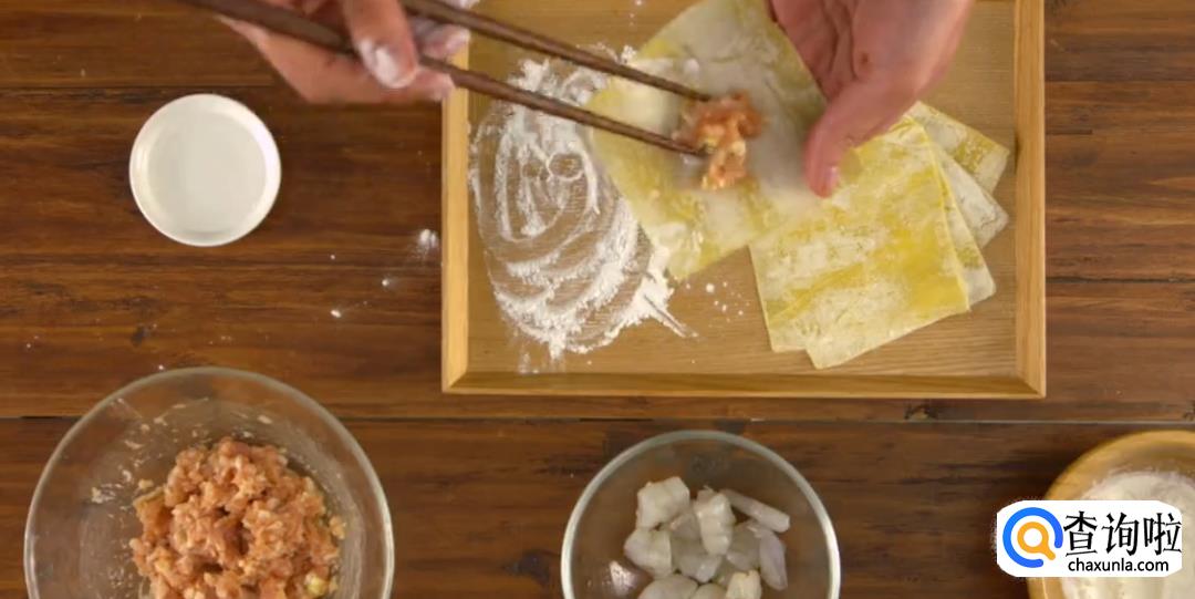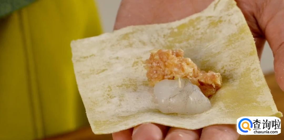 准备好爽口的海虾虾仁,将云吞皮放在手心,加入一个虾仁和少量猪肉馅。