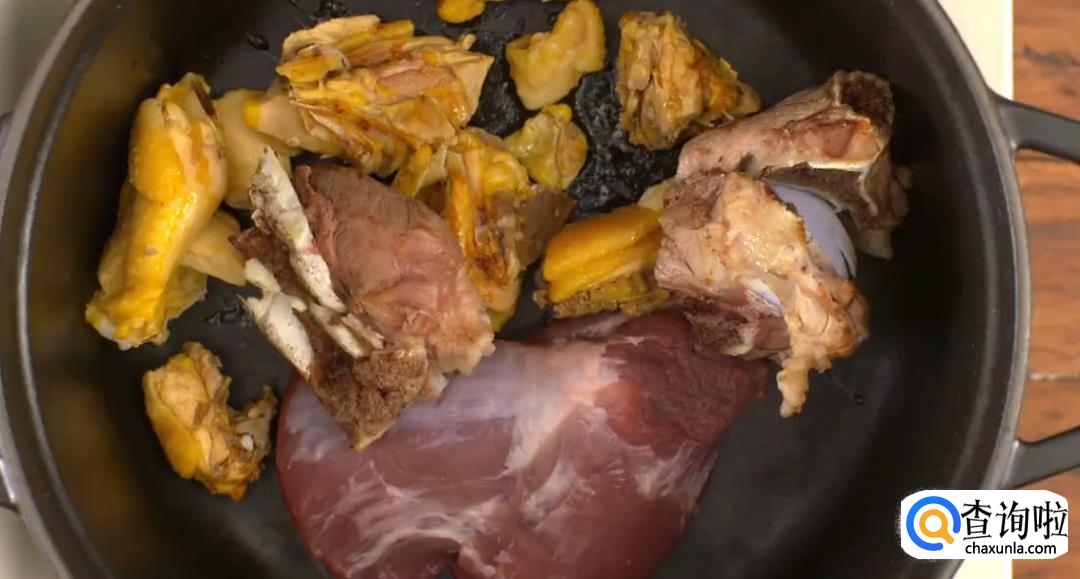 在炖锅中放入瘦猪肉,鸡肉,猪骨,虾皮,虾干,加少量虾籽粉,