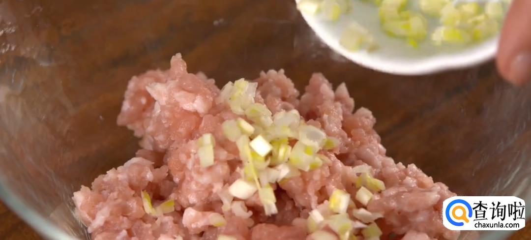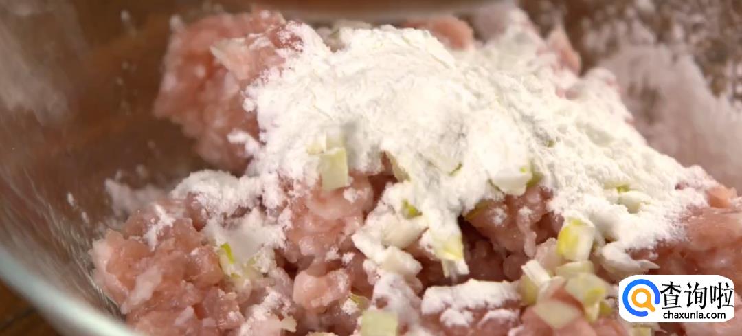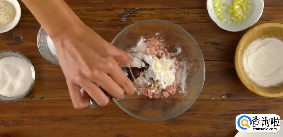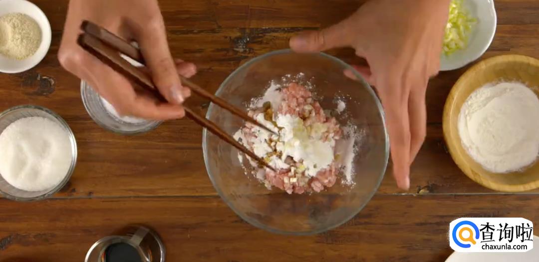 将半肥猪肉馅和韭菜黄,生粉,盐巴,糖,生抽混合,再加少量鸡粉,用筷子同方向搅拌均匀,直到搅拌出胶质。
