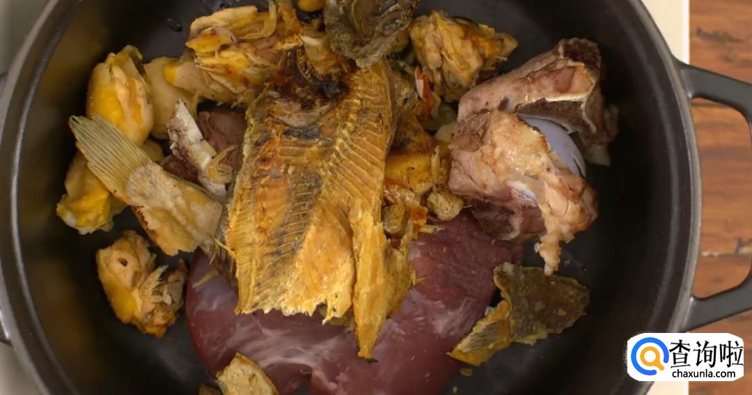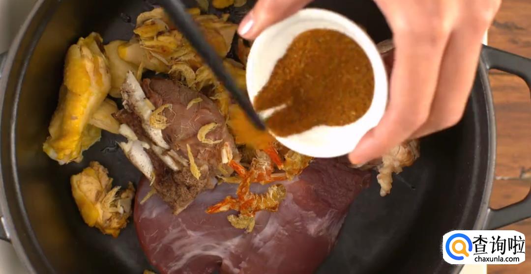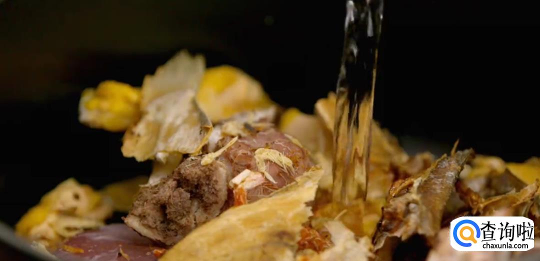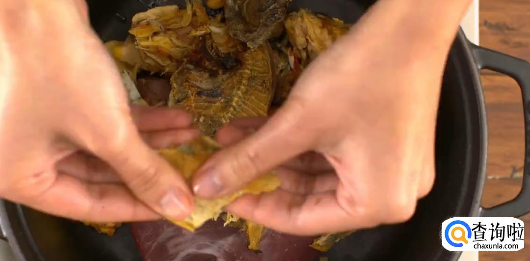 将烤制过的大地鱼干掰碎,和上述材料一起放入锅中,加足量的水炖煮,尽量保持汤底清澈。