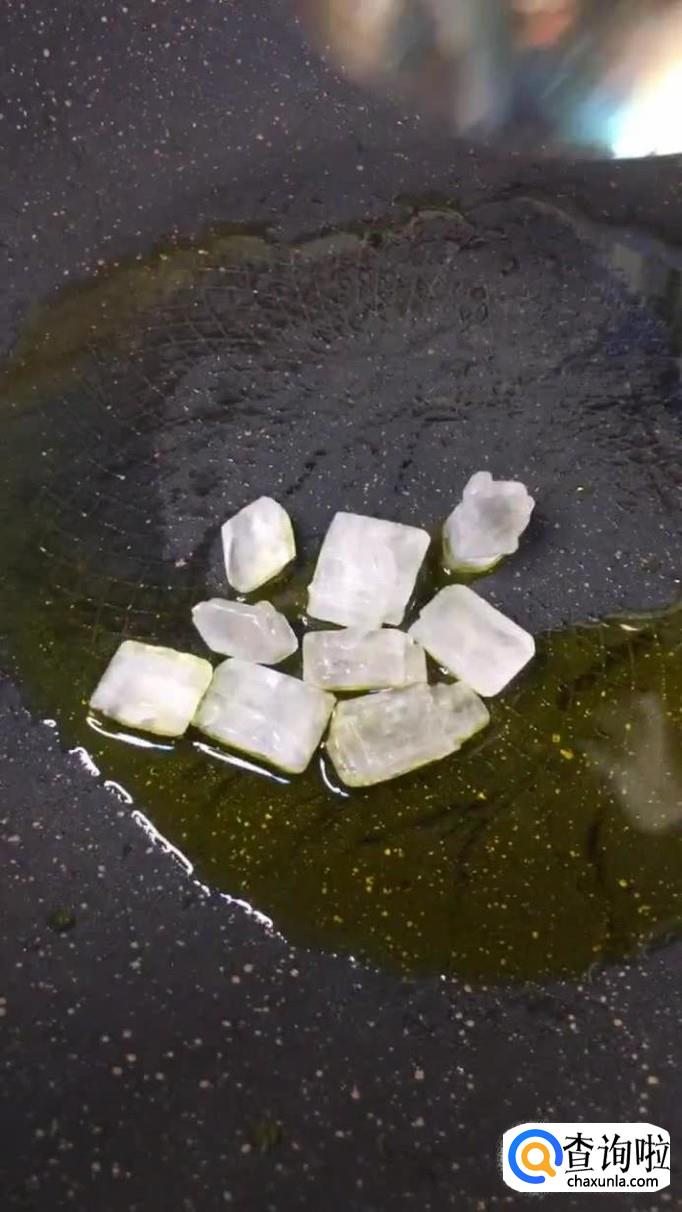 然后在炒锅中放入适量的食用油并加入几块冰糖,熬制融化,如下图所示。小贴士:大家在熬冰糖的时候最好开小火,这样能够有效地防止冰糖熬焦了。这一点大家一定要注意。