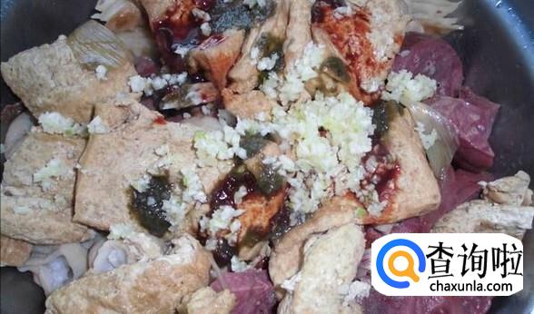 加入葱姜蒜,以及韭菜花酱,帮助提味儿。