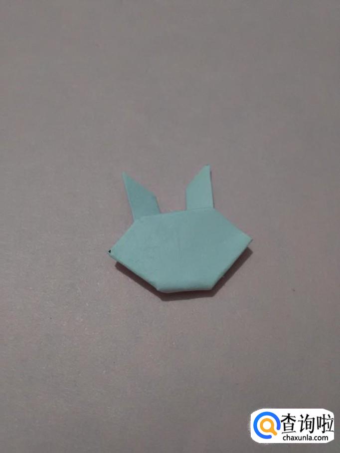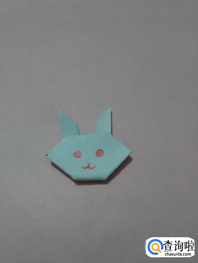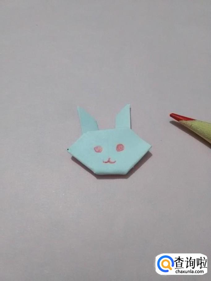用笔在兔子脸上画两个点,表示眼睛,在眼睛下面,画一个躺着的3,表示嘴,小兔子就折完了。