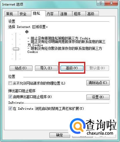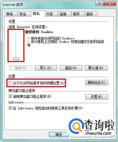 首先可以将“选择Internet区域设置”拉到最低,意思是接受所有Cookie,位置中“从不允许网站请求你的地理位置”不勾选,这两项设置相当于完全开放,有些不安全;