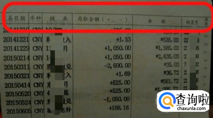 打开存折后可以看到存折最上端有一排栏目,每一格表示这一格每一竖排所代表的项目类型。如图所示。