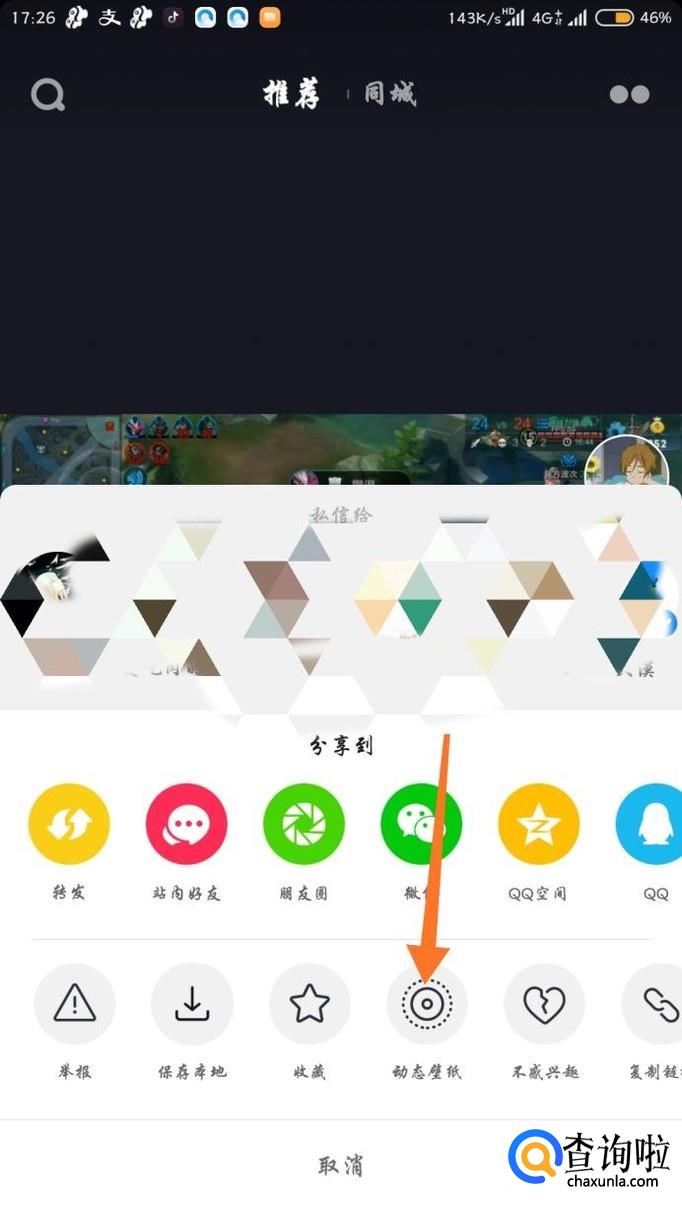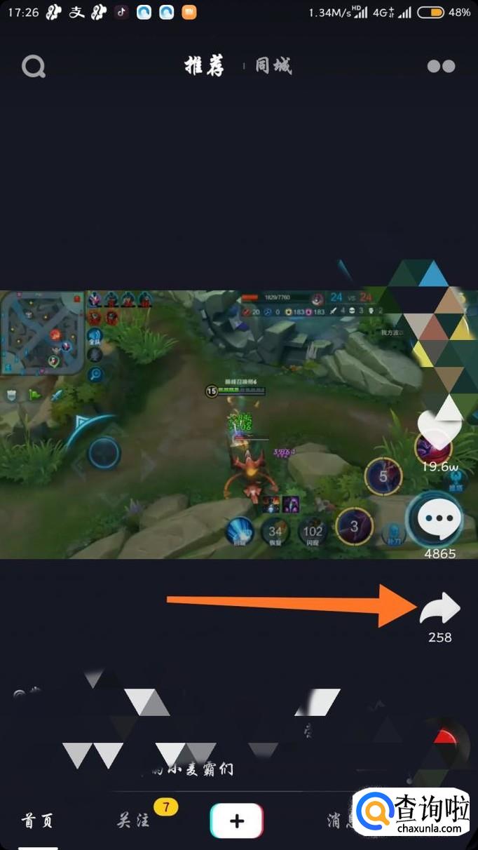 在推荐或者关注里面刷到自己喜欢的想要做壁纸的视频之后点击箭头所指分享按钮。