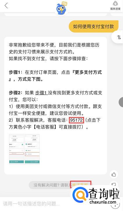 这时页面就会告诉你,在订单支付页面该如何使用支付宝进行付款。因为美团支付的时候会按照你平时的支付习惯来设置,如果你没有支付宝的选项,说明你平时用支付宝进行支付的情况比较少。这时你可以拨打页面上的客服电话,或者直接点击下方的【电话客服】,让客服为你解决。