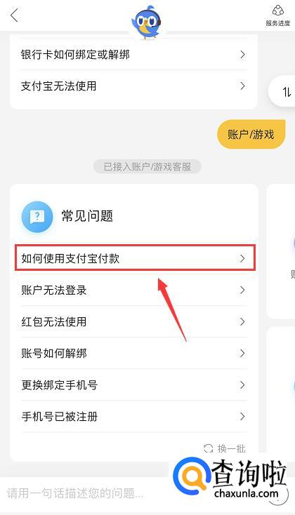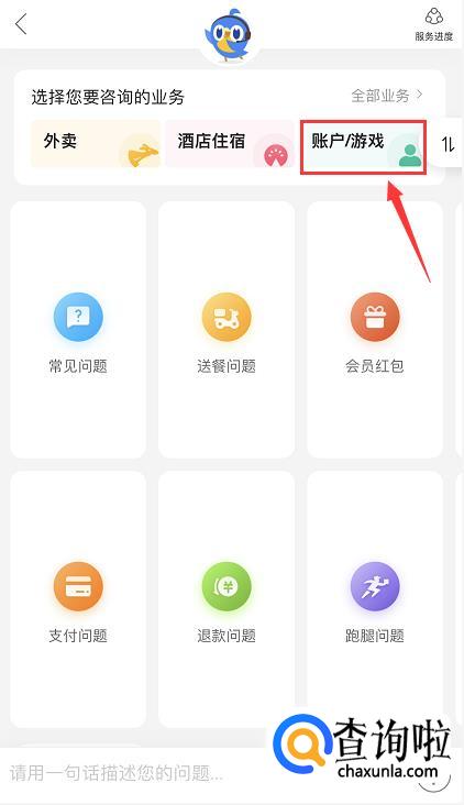 点击后进入客服页面,在“选择您要咨询的业务”一栏下,点击【账户/游戏】。