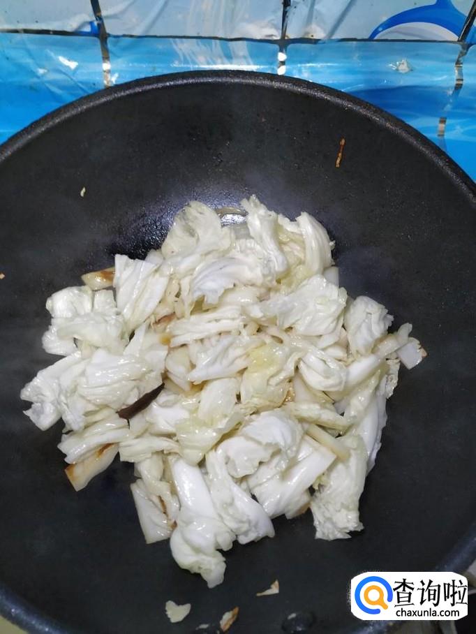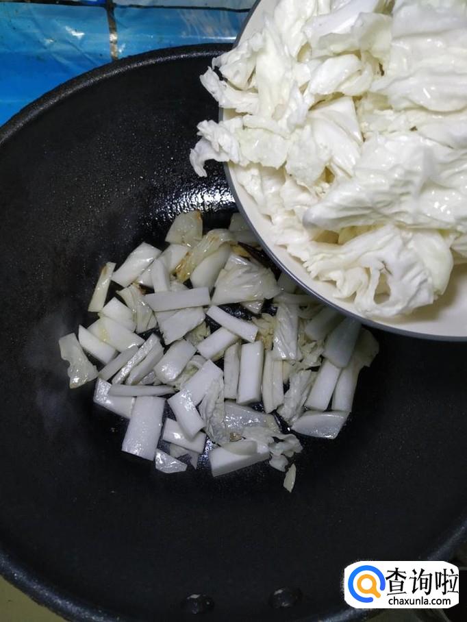 翻炒一两分钟,然后再将白菜叶倒入锅中,和白菜帮子一起翻炒,因为白菜帮子比较难熟。