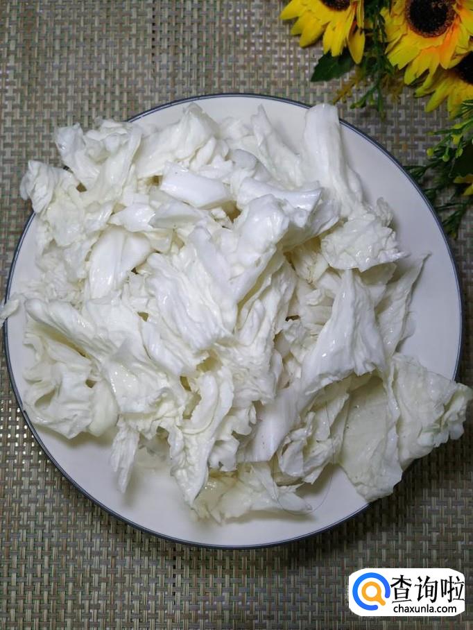 准备适量大白菜,洗净后,将白菜帮子切成条,放入盘中,将白菜叶放入另外一个盘中,沥干水备用。再准备适量枸杞子,用清水泡开。
