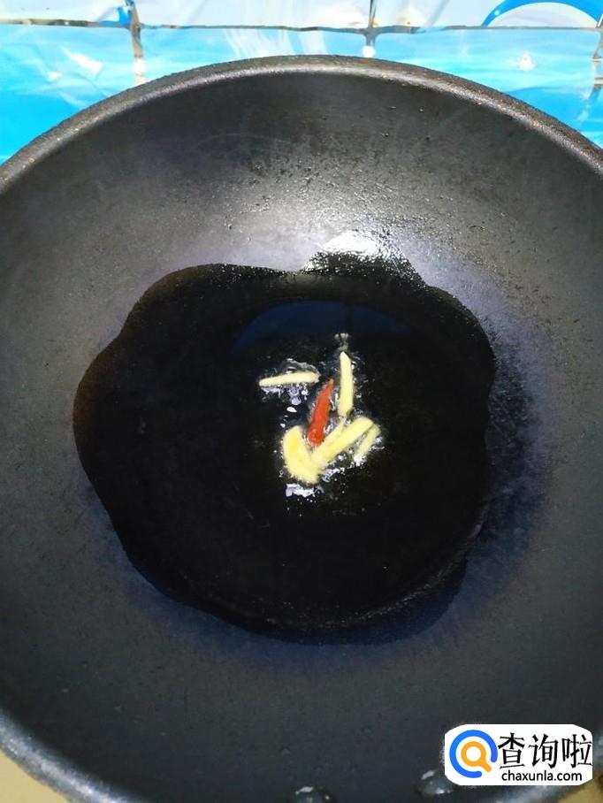 准备适量姜,切成姜丝备用,炒锅中放入适量油,油热后,将姜丝和干辣椒放入锅中炒香,然后将白菜帮子倒入锅中,翻炒均匀。