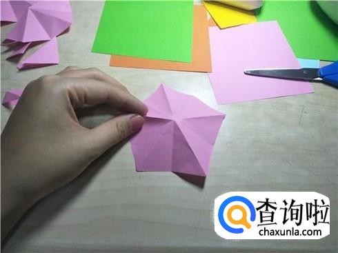 展开这个五边形图形之后,再沿着凹下去的折痕,将他们进行整理。整理之后再沿着刚刚整理的这几条折痕,将他们沿着中心的那个点进行整理重合。