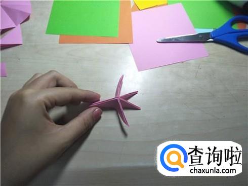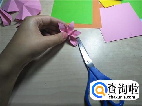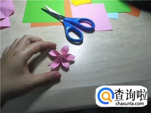 接着再将它们翻过来,拉开会看到五个比较细的边,然后再将这五个边进行整理之后把它们打开。再用剪刀将尖端部分剪成一个比较像花瓣类型的一个小口。最后再整理一下,然后一朵漂亮的小樱花就做好了。