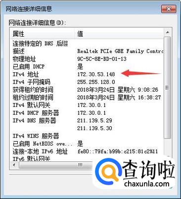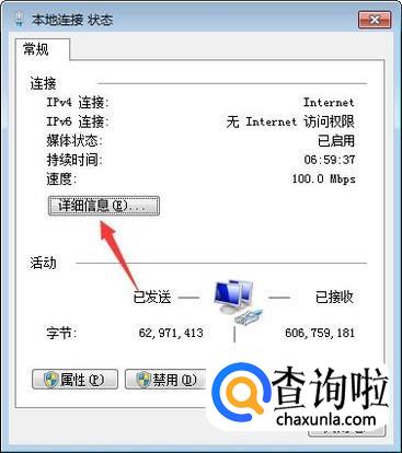 进入到详细信息界面,这时候我们就能够看见本地IP和宽带IP了