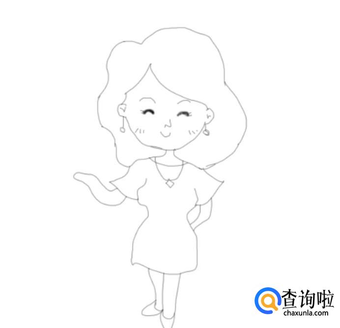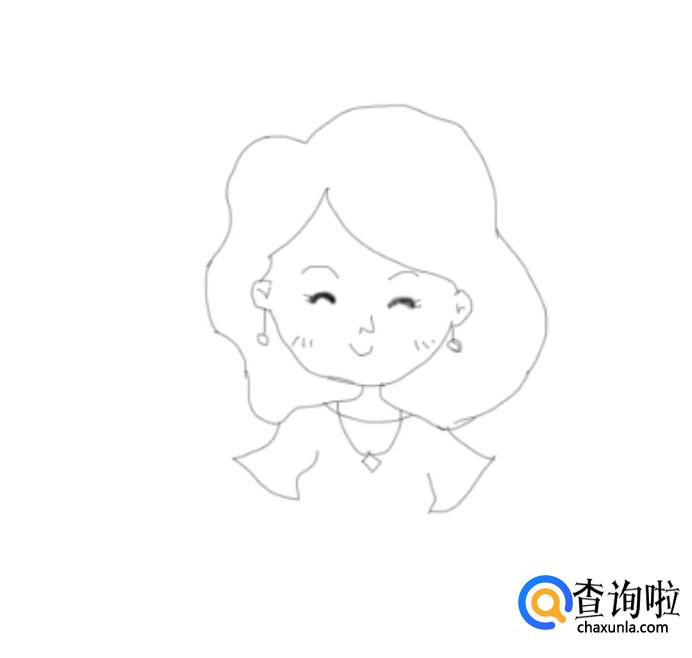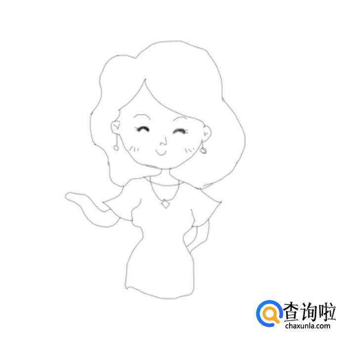 接下来到了脖子的部分啦,还可以加上漂亮的项链,并且画出肩膀,在双肩的基础上,可以画出两只胳膊,然后再画出手部。