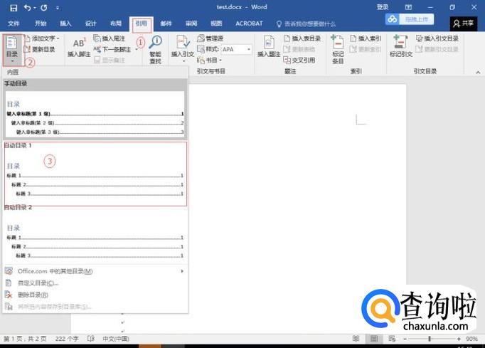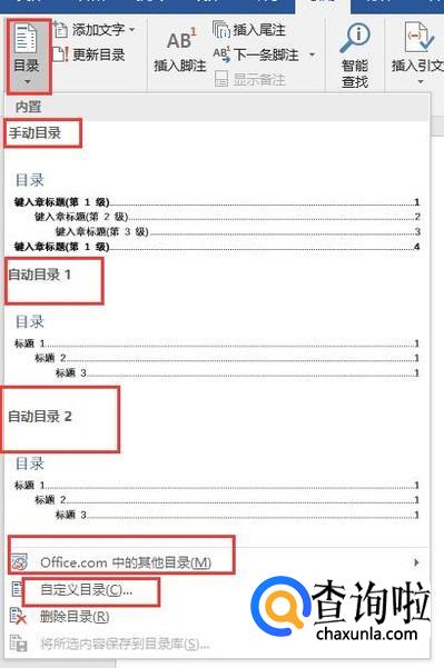 点击目录,它的下拉列表中有手动目录、自动目录1、自动目录2等,还可以添加自定义目录。这里以手动目录与自动目录为例说明一二。