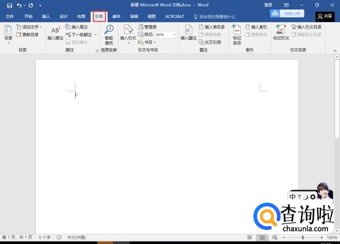 新建一个word文件并打开它,如图所示。观察菜单栏有一个"引用"按钮,点击它切换到"引用"菜单中。