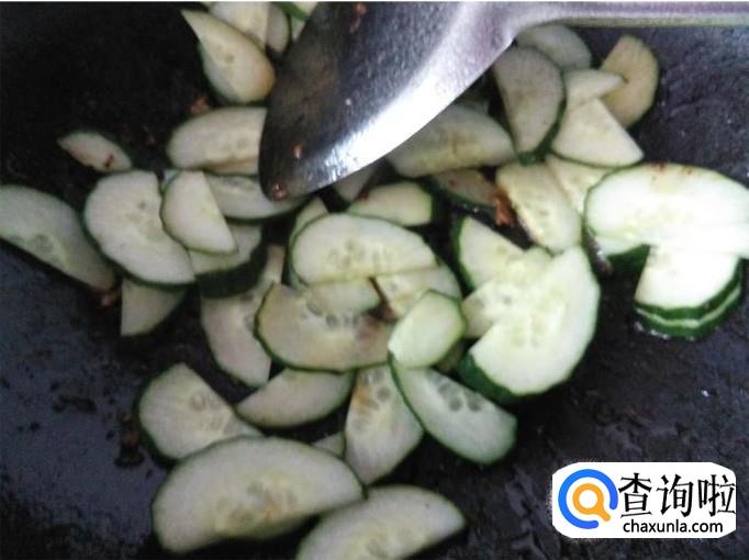 然后利用剩在锅里的油把黄瓜炒至八成熟,注意黄瓜千万不要炒的太久,不然它本身的清爽口感就会消失。