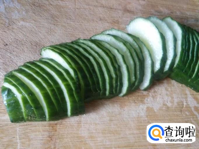 把黄瓜切片,这个菜的主材料其实特别简单,但是都要提前备好,切好的黄瓜片用盘子装好备用。