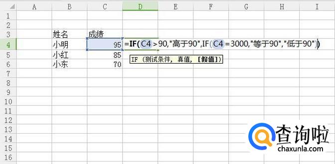接着在D4单元格输入=IF(C4>90,"高于90",IF((C4=90,"等于90","低于90")),如下图所示。