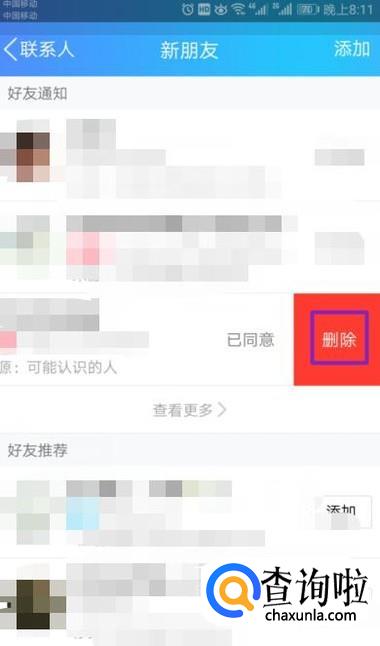 之后就会出现删除按钮了,我们点击删除就可以删除掉新朋友的添加记录了,还是比较简单的,相信大家现在都会了。