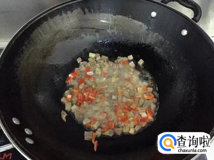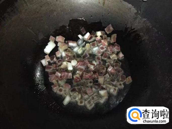 锅内倒入适量食用油烧热,然后倒进切好的腊肉丁入锅翻炒至变色。