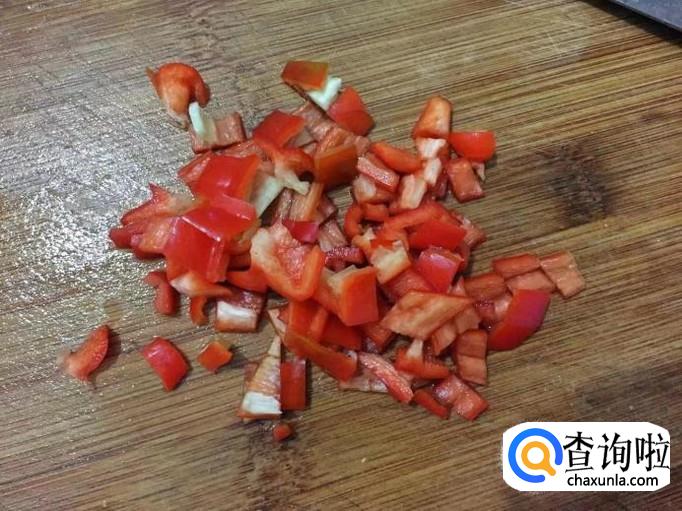 红辣椒去掉辣椒籽还有辣椒蒂,用清水清洗干净,然后切成辣椒丁,备用。