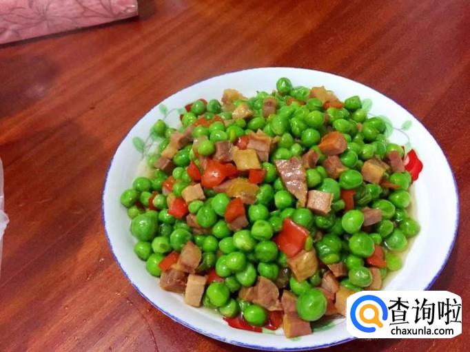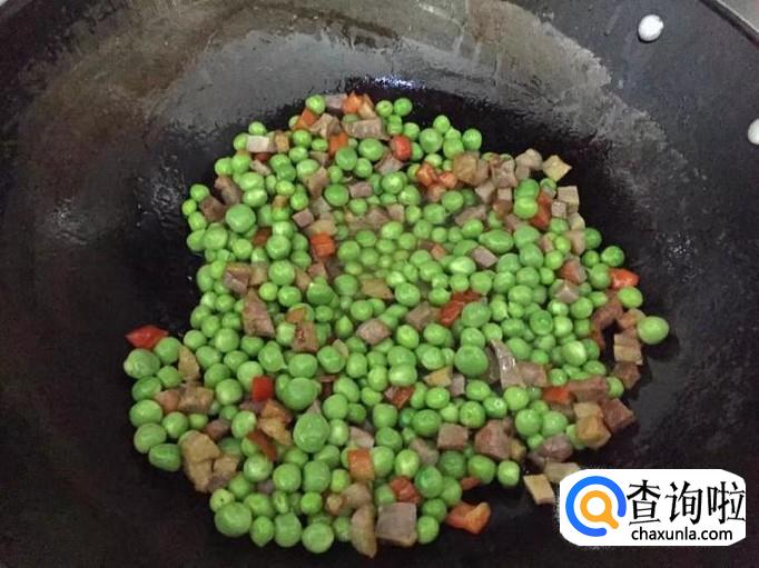 最后倒进豌豆粒入锅翻炒,其间加入少许蚝油翻炒均匀后入盐调味,并加入少许清水稍微焖一下。
