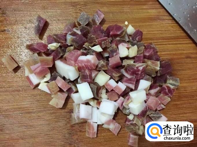 腊肉有点咸,所以我先用清水浸泡了半个钟头后捞出,再切成丁状,如图。