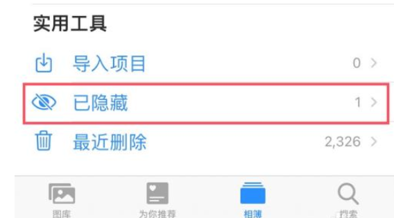 2、进入照片页面后,拉到最后找到实用工具里的“已隐藏”。