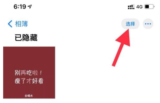 3、在已隐藏照片页面里,点击右上角的“选择”文字。