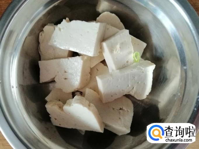 取适量新鲜的豆腐,用刀把豆腐切块待用。豆腐的薄厚、大小根据自己喜好切,但不要切太厚,不容易入味。