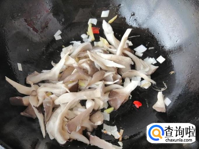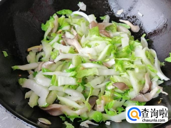炒锅放油,油热后放入葱、辣椒、姜丝,炒出香味后放入蘑菇,用铲子快速翻炒均匀,然后放入切好的白菜杆部分。