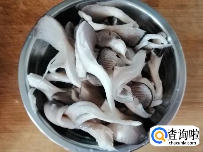 取适量新鲜的蘑菇,用剪刀剪掉老根,用清水把蘑菇洗净,然后把洗好的蘑菇,用手撕成蘑菇条待用。