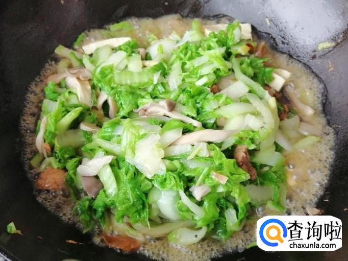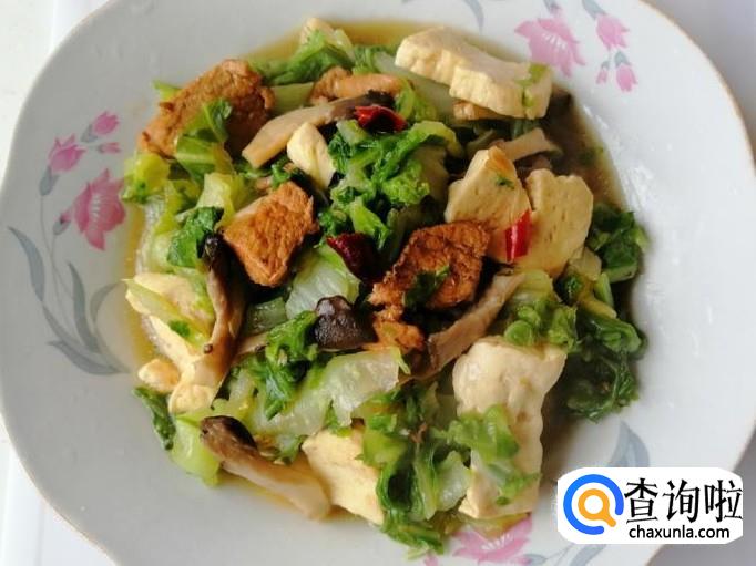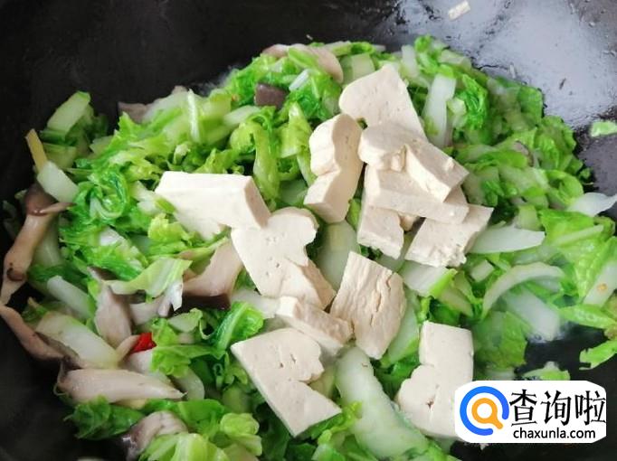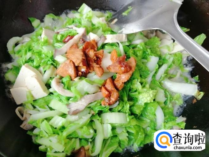 翻炒片刻后加入白菜叶子部分,再放入备好的豆腐,最后加入熟肉,用铲子快速翻炒均匀,蘑菇白菜都比较容易出水,所以炒菜就不要加水了。