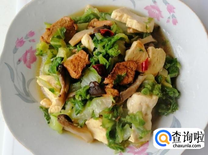 查看所有食材熟了后,加入适量生抽和食盐,翻炒均匀。如图所示我们的白菜蘑菇豆腐炒肉就做好了,出锅入盘就可以开吃了。