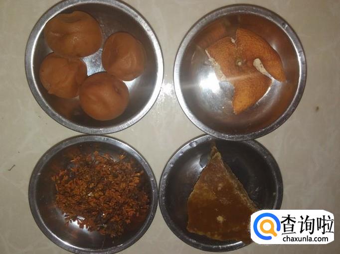腌制过的酸梅4粒,干桂花5克,陈皮5克,土红糖适量。