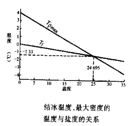 当盐度低于24.695(也就是含盐量2.4695%)时,海水的行为跟淡水类似,对流,到达最大密度温度,对流停止,上层结冰;当盐度恰好是24.695的时候,最大密度温度和冰点都是-1.33℃;当盐度大于24.695(开放大洋中海水的盐度通常在30左右)时,海水在整体到达冰点之前会持续不断的对流,所以很难结冰。